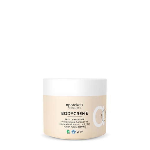 Apotekets Parfumefri Bodycreme er en ekstra fugtgivende, mild og skånsom creme til kroppen. Cremen har en lækker, fyldig konsistens og bliver hurtigt absorberet uden at fedte. Apotekets Parfumefri Bodycreme har et højt indhold af blødgørende kakao- og shea butter, glycerin som beskytter huden og tilfører fugt, og kreatin som styrker hudens bindevæv, så huden bliver mere elastisk. Apotekets Parfumefri Bodycreme er Svanemærket og Astma-Allergideklareret.