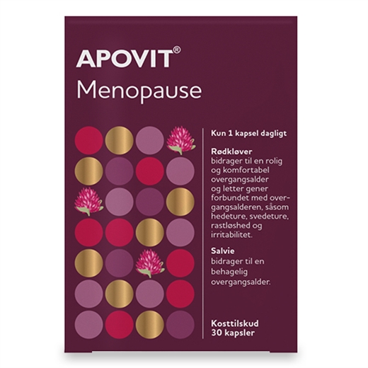 Apovit Menopause er et kosttilskud med ekstrakter af rødkløver og salvie samt vitamin B6 og vitamin E. Rødkløver bidrager til en rolig og komfortabel overgangsalder og letter gener forbundet med overgangsalderen, såsom hedeture, svedeture, rastløshed og irritabilitet. Salvie bidrager til en behagelig overgangsalder. Vitamin B6 bidrager til at regulere hormonaktiviteten. Vitamin E bidrager til at beskytte cellerne mod oxidativt stress.