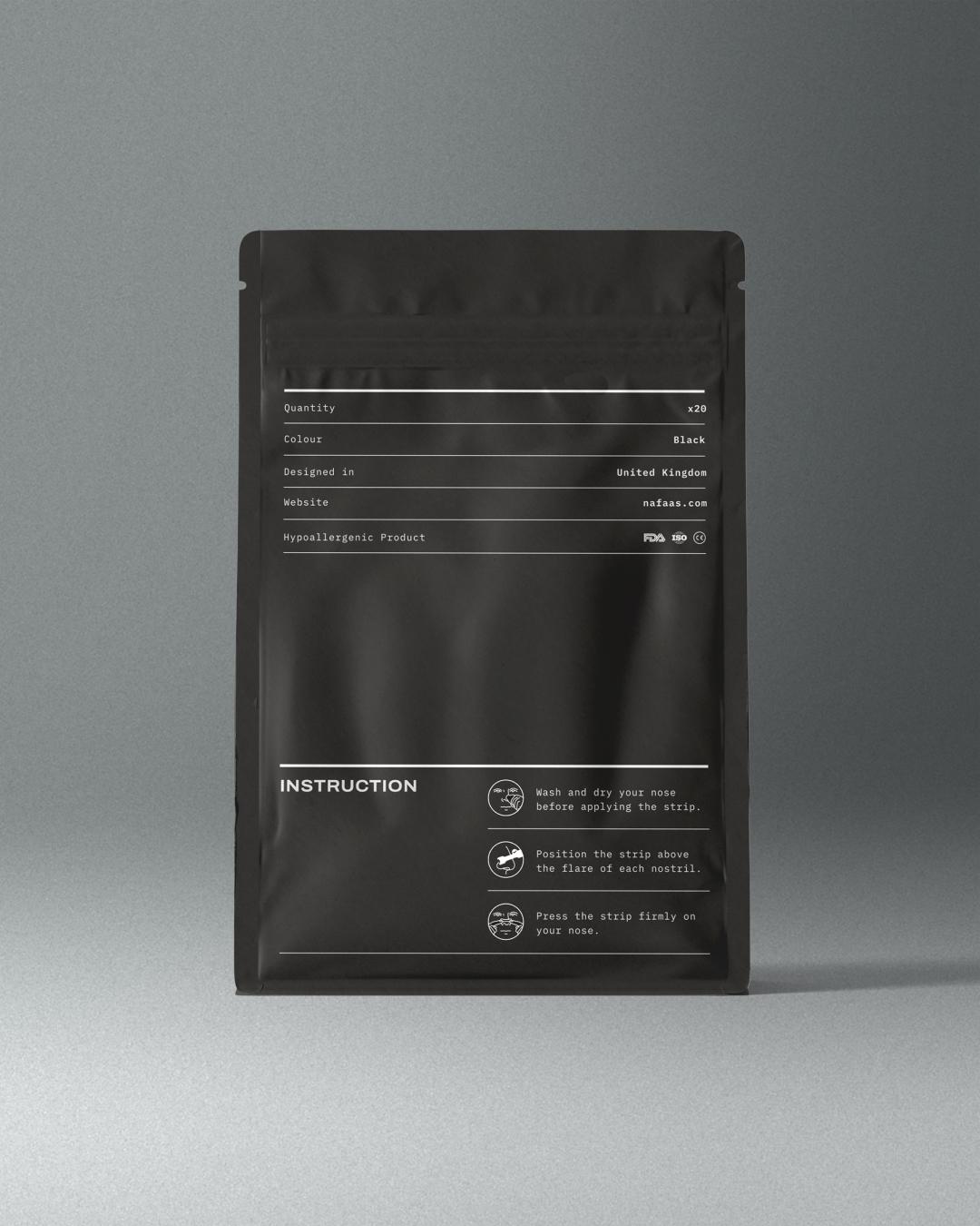 Nafaas næsestrips hjælper dig med at få mere luft gennem næsen – hvad enten du sover, træner eller bare har brug for at kunne trække vejret bedre. Udviklet i London med fokus på effektivitet og et enkelt, stilrent design.