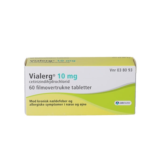 Anvendelsesområde: Voksne og børn fra 6 år: Lindring af symptomer i øjne og næse ved sæsonbetinget og helårs allergisk snue. Lindring af symptomer ved kronisk nældefeber. Dosering: Voksne og børn over 12 år: 1 tablet dagligt. Børn 6-12 år: ½ tablet 2 gange dagligt. Nedsat nyrefunktion: Dosisjustering anbefales til patienter med moderat til alvorligt nedsat nyrefunktion. Må ikke anvendes: Ved overfølsomhed over for indholdsstofferne eller overfor hydroxyzin eller piperazin derivater (nært beslægtede aktive stoffer i andre lægemidler). Ved alvorligt nedsat nyrefunktion. Forsigtighedsregler: Indeholder lactose. Forsigtighed ved samtidig indtagelse af alkohol, ved epilepsi og ved patienter med øget risiko for vandladningsproblemer. Hvis du skal have foretaget en allergitest, så skal du stoppe med at tages Vialerg mindst 3 dage inden. Intens kløe (pruritus) og/eller nældefeber (urticaria) kan i sjældne tilfælde vende tilbage, hvis du stopper med at tage Vialerg. Graviditet og amning: Bør ikke anvendes, tal med lægen. Bivirkninger: Ikke almindelige: Utilpashed, kløe, udslæt, diarré, stikkende og snurrende fornemmelse i huden, rastløs uro. Sjældne: Overfølsomhedsreaktioner, aggression, forvirring, depression, hallucinationer, søvnløshed, kramper, for hurtig hjerterytme, unormal leverfunktion, nældefeber, ødem, vægtøgning. Meget sjældne: Alvorlige overfølsomhedsreaktioner (anafylaktisk shock, hævelse af svælg og tunge (angioneurotisk ødem), udslæt), tics, lavt antal blodplader, bevidsthedstab, rystelser, muskelspændinger, ufrivillige bevægelser, smagsforstyrrelser, synsforstyrrelser, svien eller smerte ved vandladning, ufrivillig natlig vandladning. Ukendt frekvens: Øget appetit, selvmordsforestillinger, mareridt, hukommelsestab, hukommelsesbesvær, svimmelhed, problemer med at tømme blæren. Intens kløe (pruritus) og/eller nældefeber (urticaria) efter behandlingsstop, smerter i leddene, udslæt med betændte blærer, leverbetændelse (hepatitis) Pakningsstørrelser: 10, 20, 30, 60,100 og120stk. Registreringsindehaver: Orifarm Generics A/S, Energivej 15, 5260 Odense S.